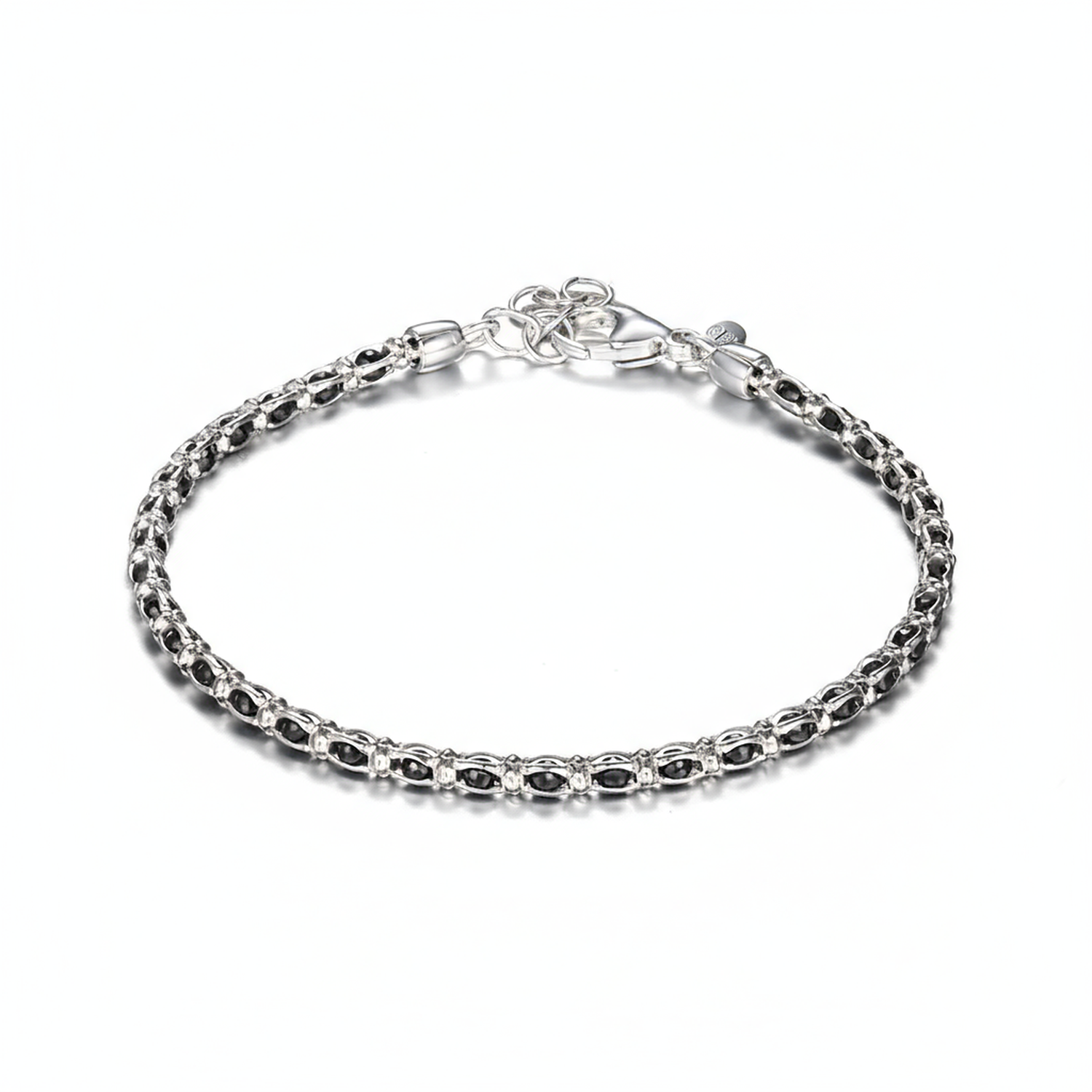 Drawing inspiration from contemporary Italian design, this bracelet masterfully sets a series of brilliant black cubic zirconia stones within an intricate sterling silver weave. The design creates a powerful statement, where modern edginess meets refined craftsmanship.