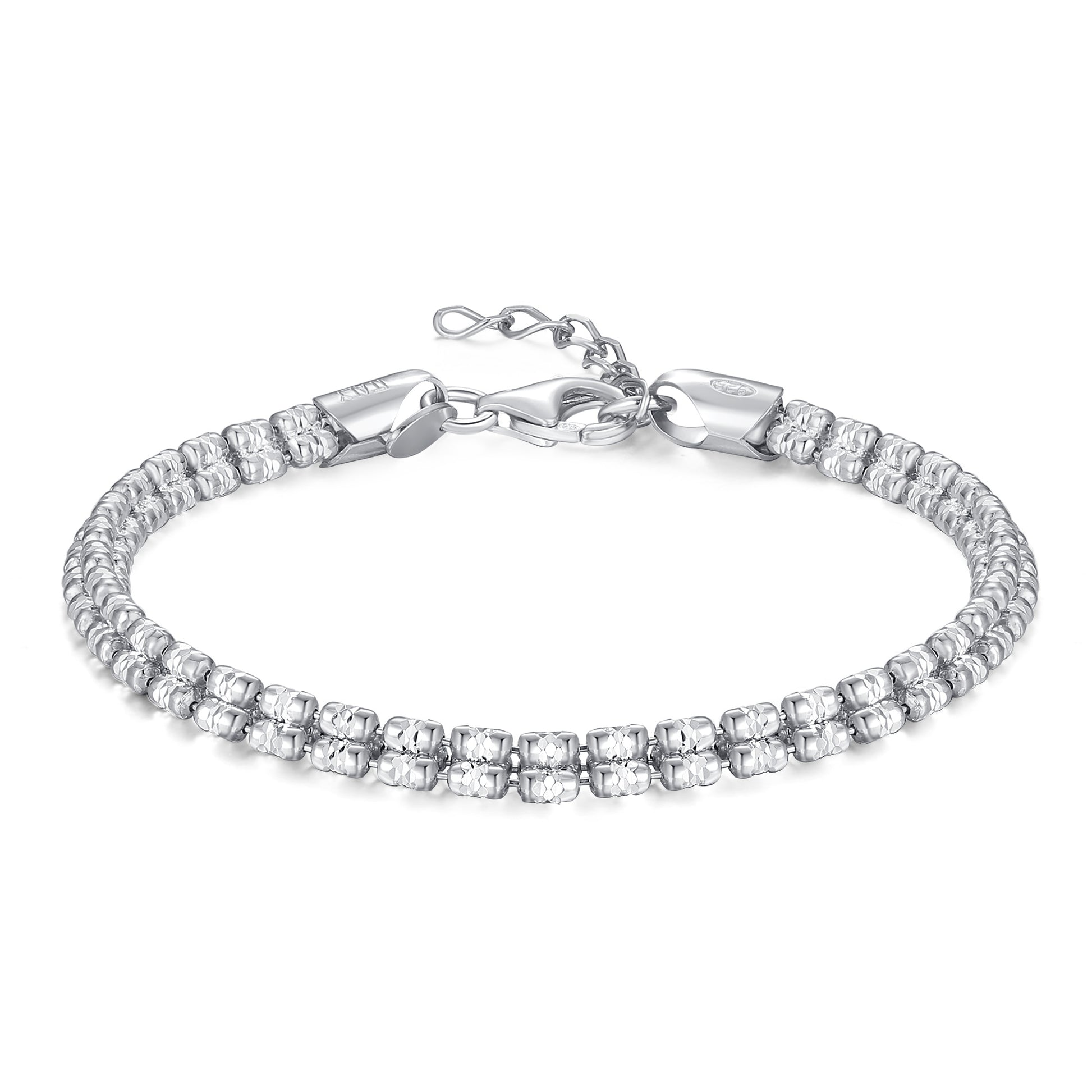Two precise lines of round, faceted crystals run seamlessly around the wrist, creating continuous shine that catches the light from every angle.