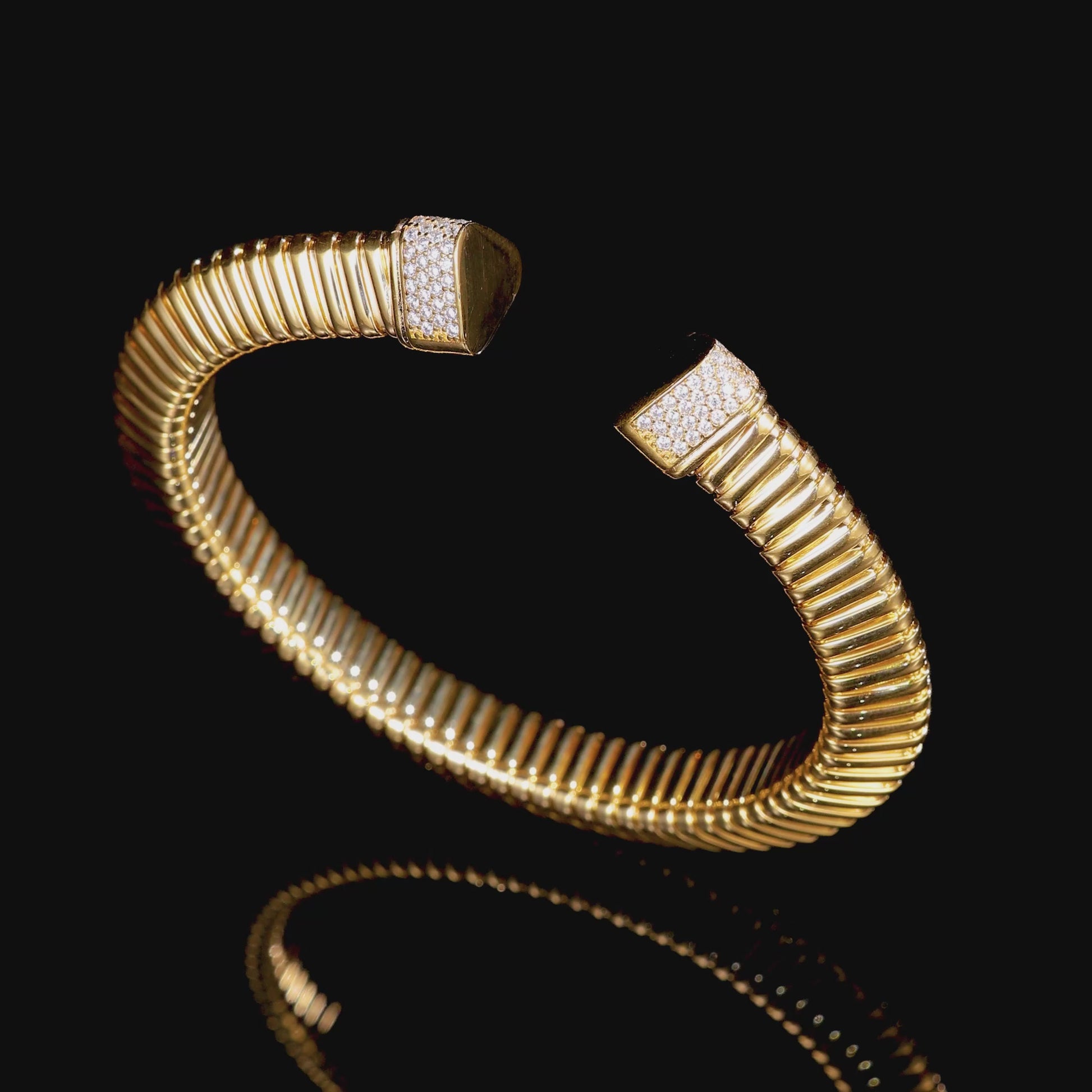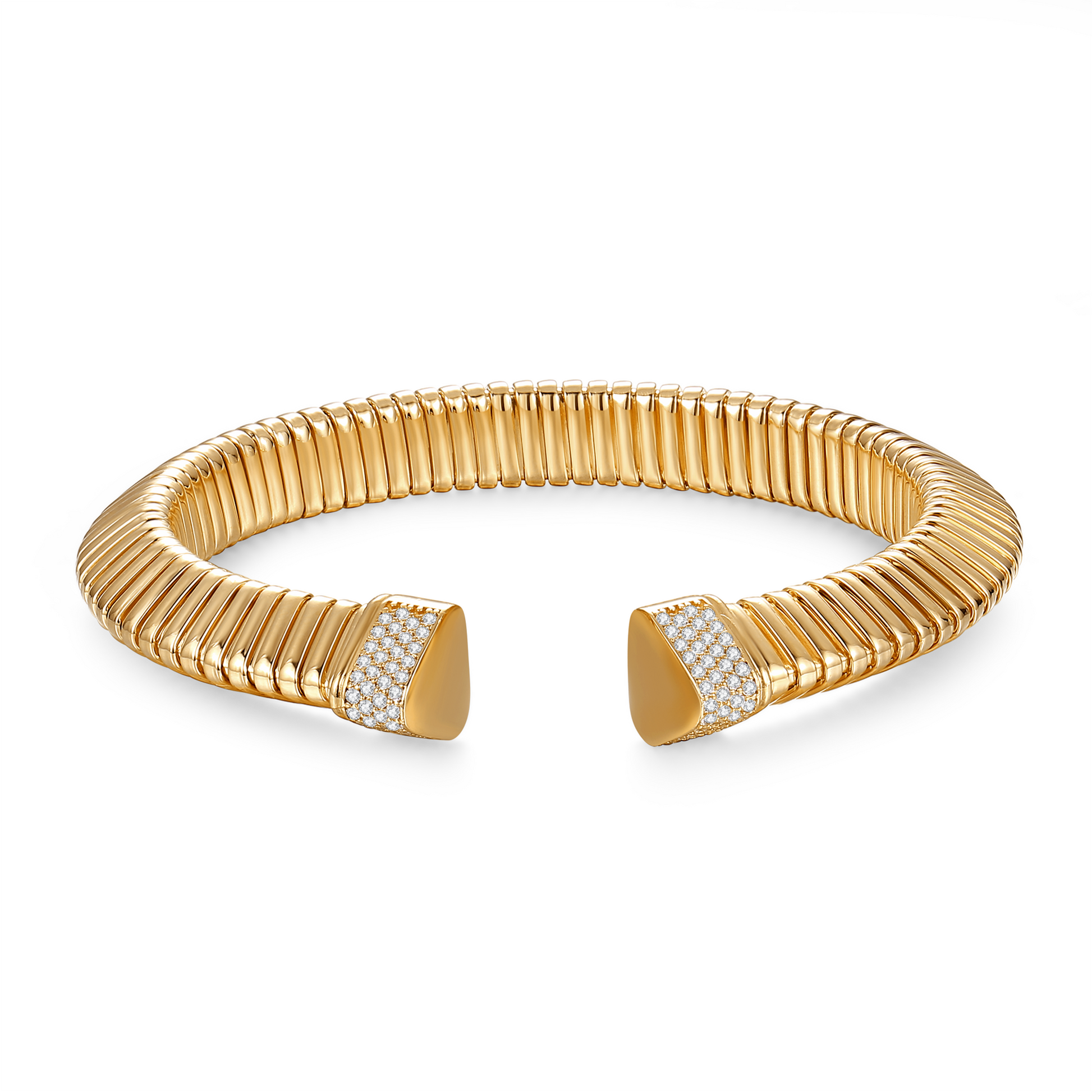 At each end, pavé-set white cubic zirconia (CZ) adds a crisp, luminous sparkle—creating a refined contrast against the smooth, warm yellow finish.