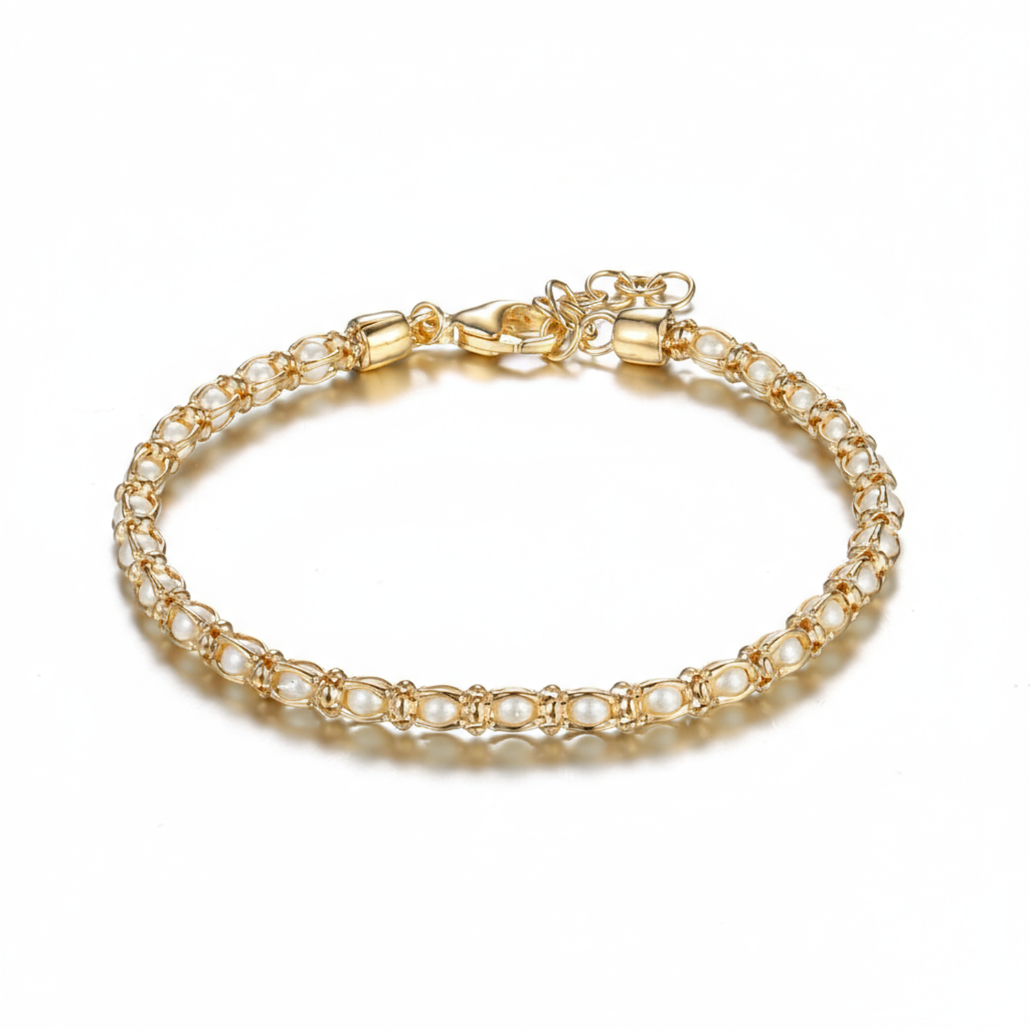 Inspired by classic Italian weaving, this bracelet delicately intertwines luminous, round pearls within a refined sterling silver chain, capturing a sense of pure, everlasting love.